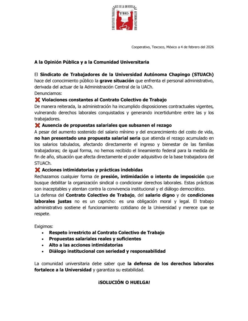 El Sindicato de Trabajadores de la Universidad Autónoma Chapingo (STUACh) hace del conocimiento público la grave situación que enfrenta el personal administrativo, derivada del actuar de la Administración Central de la Universidad Autónoma Chapingo.