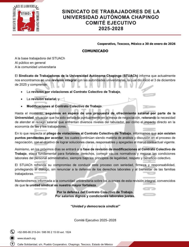 El Sindicato de Trabajadores de la Universidad Autónoma Chapingo (STUACh) informa a su base trabajadora, a la comunidad universitaria y al público en general que actualmente se encuentra en proceso de revisión integral con las autoridades universitarias, iniciado el 3 de diciembre de 2025.