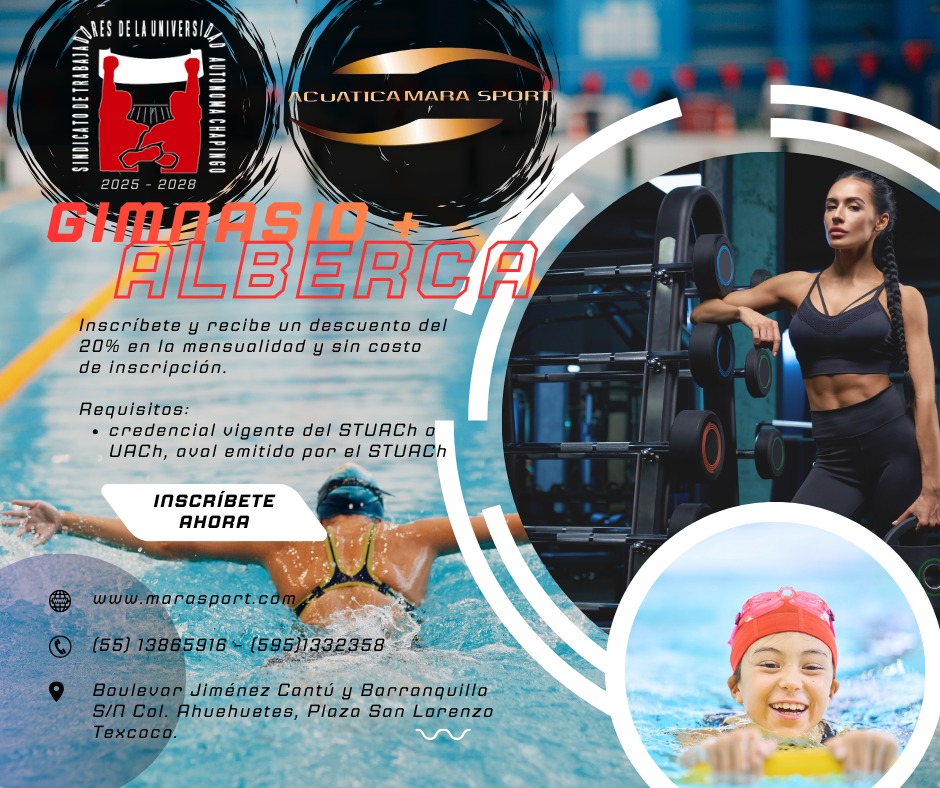 El Sindicato de Trabajadores de la Universidad Autónoma Chapingo (Comité Ejecutivo 2025–2028) informa a sus agremiados sobre el convenio establecido con Acuática Mara Sport, mediante el cual se otorgan beneficios exclusivos en servicios de gimnasio y alberca.