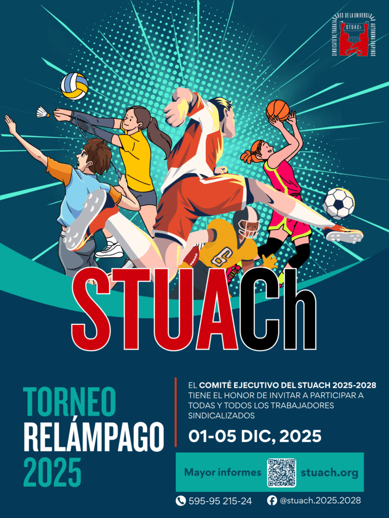 El Comité Ejecutivo del Sindicato de Trabajadores de la Universidad Autónoma Chapingo (STUACh) 2025–2028 invita cordialmente a todas y todos los trabajadores a formar parte del Torneo Relámpago STUACh 2025, un encuentro deportivo pensado para fortalecer la integración, el compañerismo y la sana convivencia dentro de nuestra comunidad.